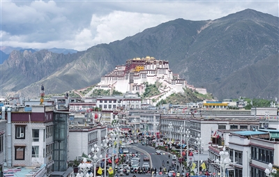 在庆祝西藏自治区成立60周年之际,拉萨街头张灯结彩,处处洋溢着喜庆氛围。
