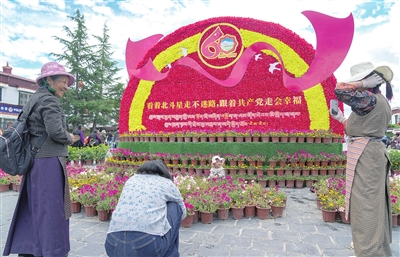 ③8月19日,一名小朋友在大昭寺广场前的花坛处拍照留影。