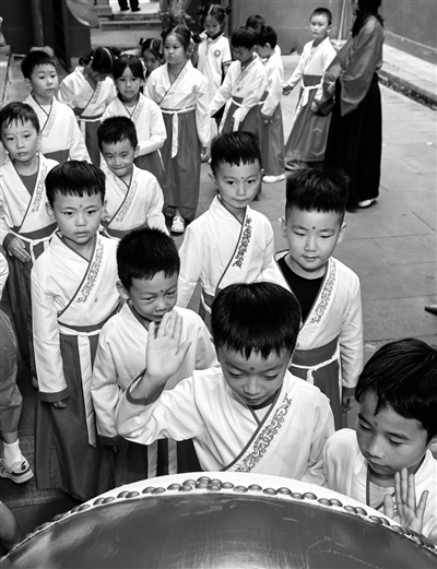 9月23日,萍师附小教育集团一年级新生开笔礼在萍乡孔庙举行。学生们穿汉服,经棂星门、大成门,正衣冠、拜先师、朱砂启智、击鼓明志、启蒙描红“人”字,体验传统文化,开启求知路。