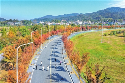 近日,安源区五陂镇十里花溪,火红的榉树叶随风轻舞,如同跳动的音符,为初冬季节奏响浪漫乐章,引得游客纷至沓来,尽情享受大自然馈赠的视觉盛宴。 (邓建萍 摄)